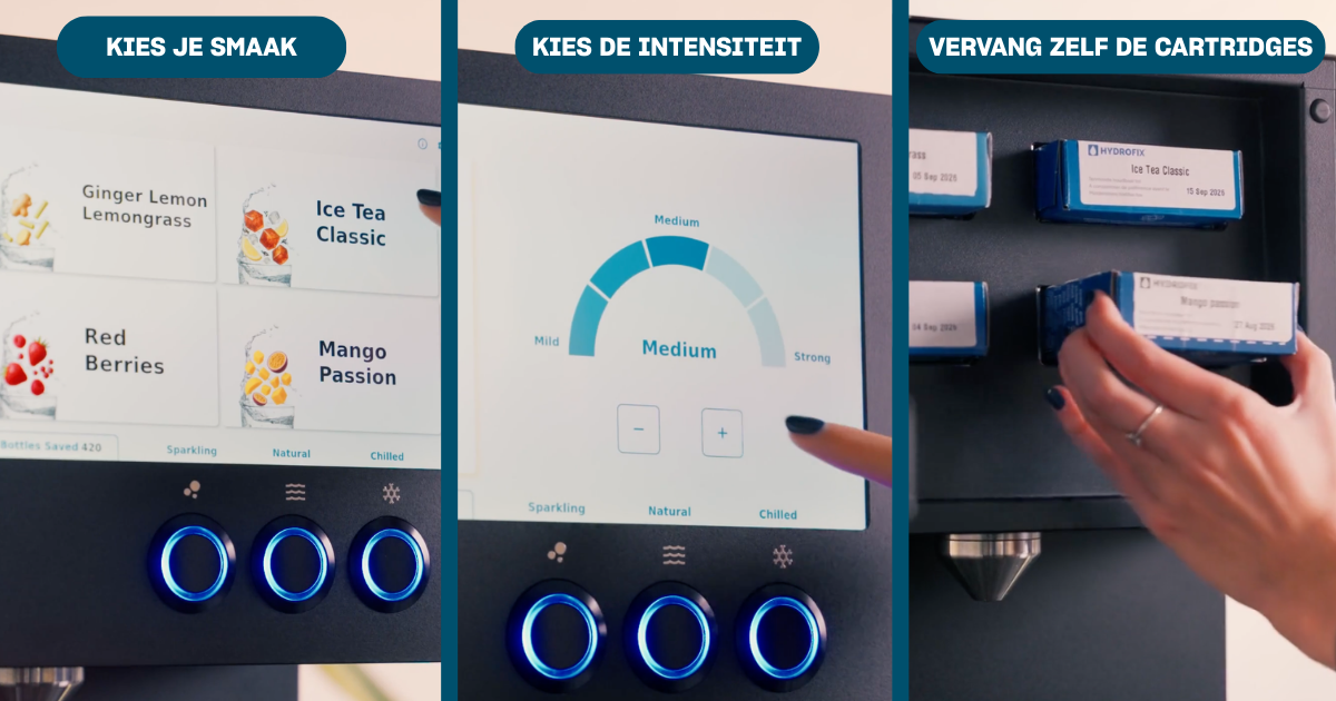 Nieuw in ons aanbod: de Hydrofix. Een slimme waterdispenser waarmee je tot wel 4 verschillende soorten smaakwater kan tappen. Het toestel is 100% designed & made in Belgium.