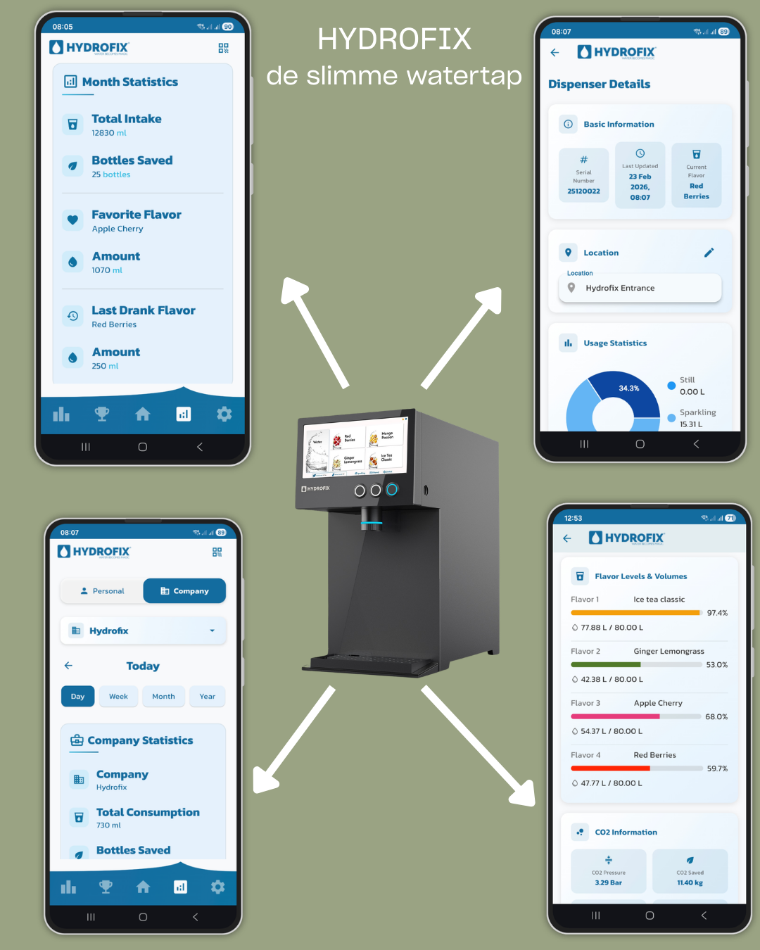 De Hydrofix is de eerste slimme Belgische watertap. Via de handige app zie je in één oogopslag alles: hoeveel er nog in de smaak-cartridges zit, welke smaak er meest wordt getapt, hoeveel plat en bruisend water er werd gedronken enz. Ook als je meerdere toestellen hebt, helpt de app je met het beheer van al je toestellen. Zelfs als die in verschillende gebouwen staan. Geen gedoe met wifi of netwerkkabels: de Hydrofix is namelijk permanent rechtstreeks verbonden met het internet via de ingebouwde 4G verbinding.